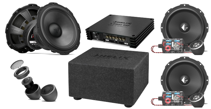 Profesionální montáž prémiových předních středobasů a výšek Helix Ci5 (aktivní zapojení) a zadních reproduktorů Helix Ci3. Reproduktory usazujeme do přesných podložek pro konkrétní vozidlo. Montáž subwooferu do rezervy, případně jiného typu na vhodné místo. Zapojení všech reproduktorů na šestikanálový zesilovač HELIX 206 DSP a jeho kompletní naladění na míru zákazníka.