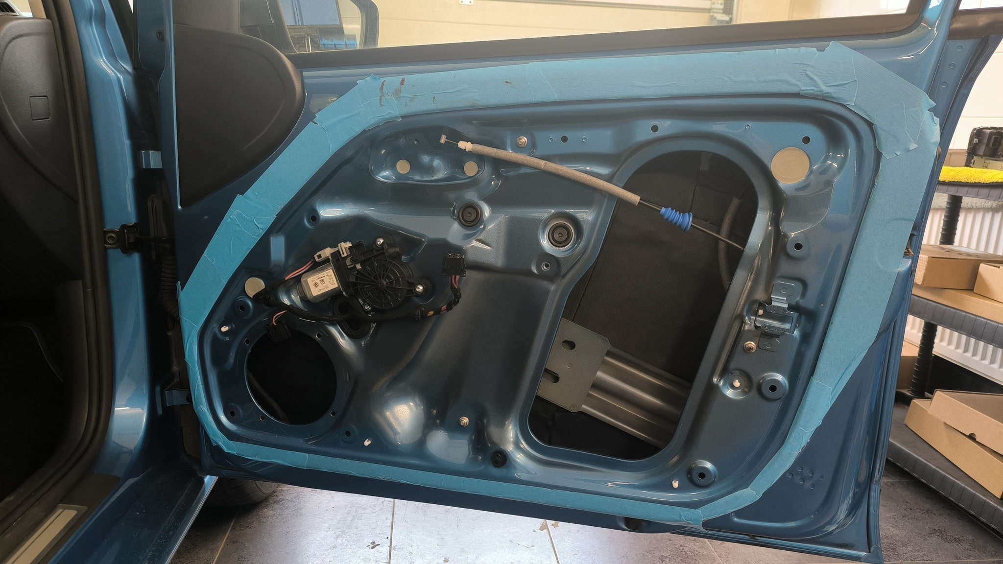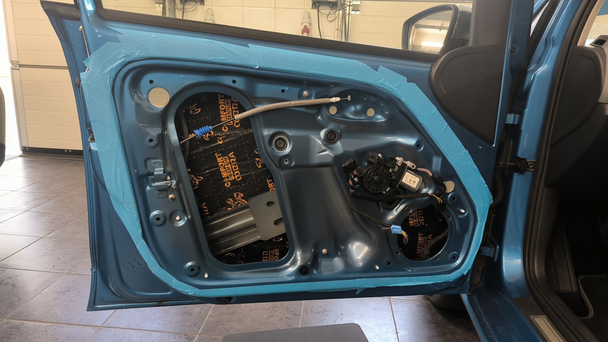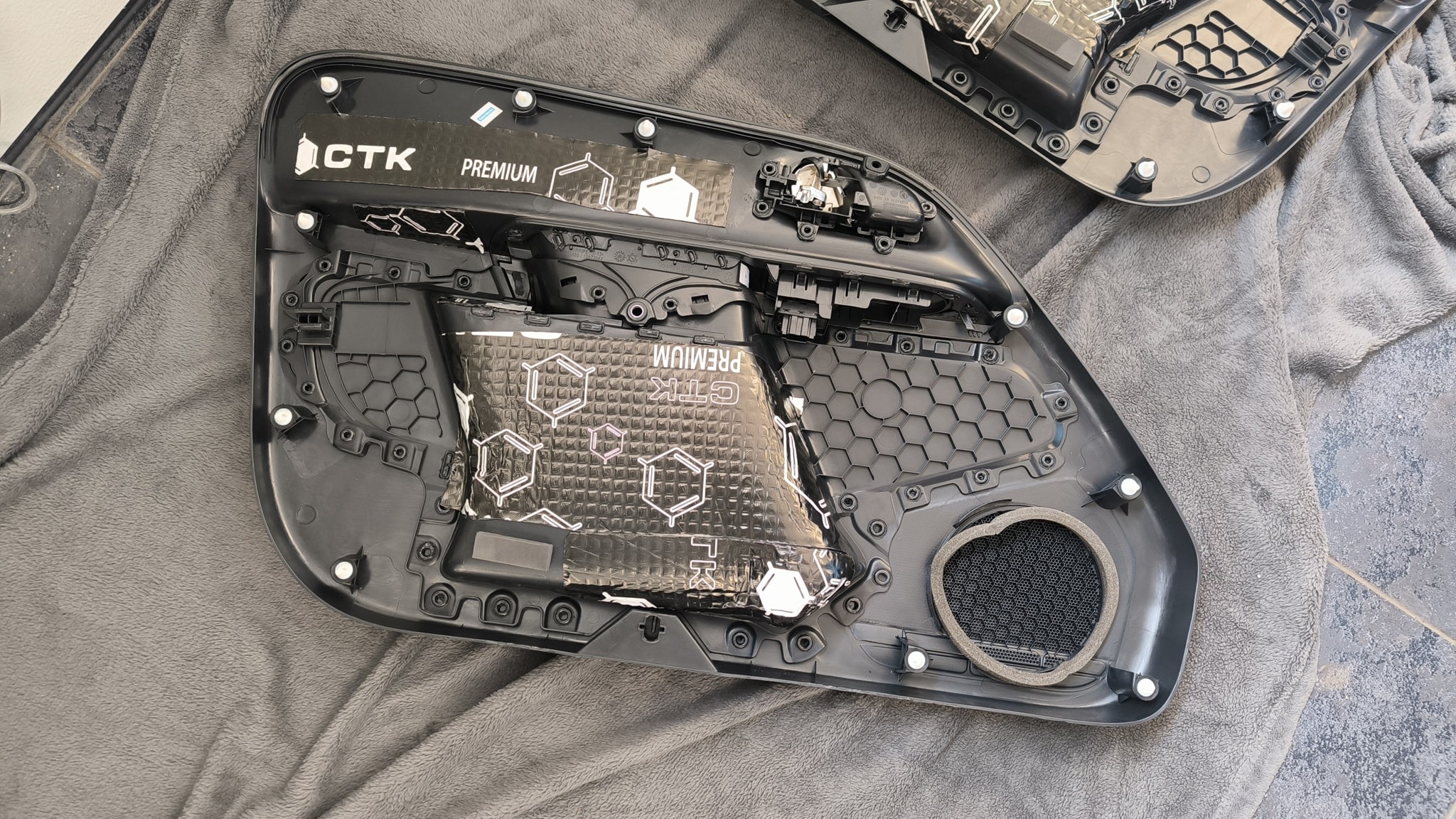 A v druhé vrstvě kompletní vylepení měkkým, zvuk pohlcujícím materiálem, která zamezí rezonancím mezi obložení dveří a plechem