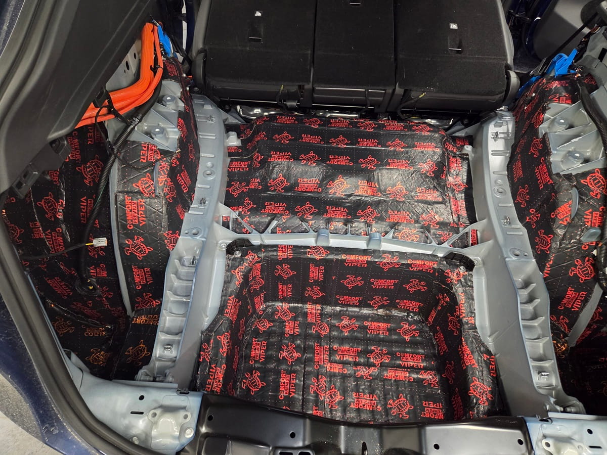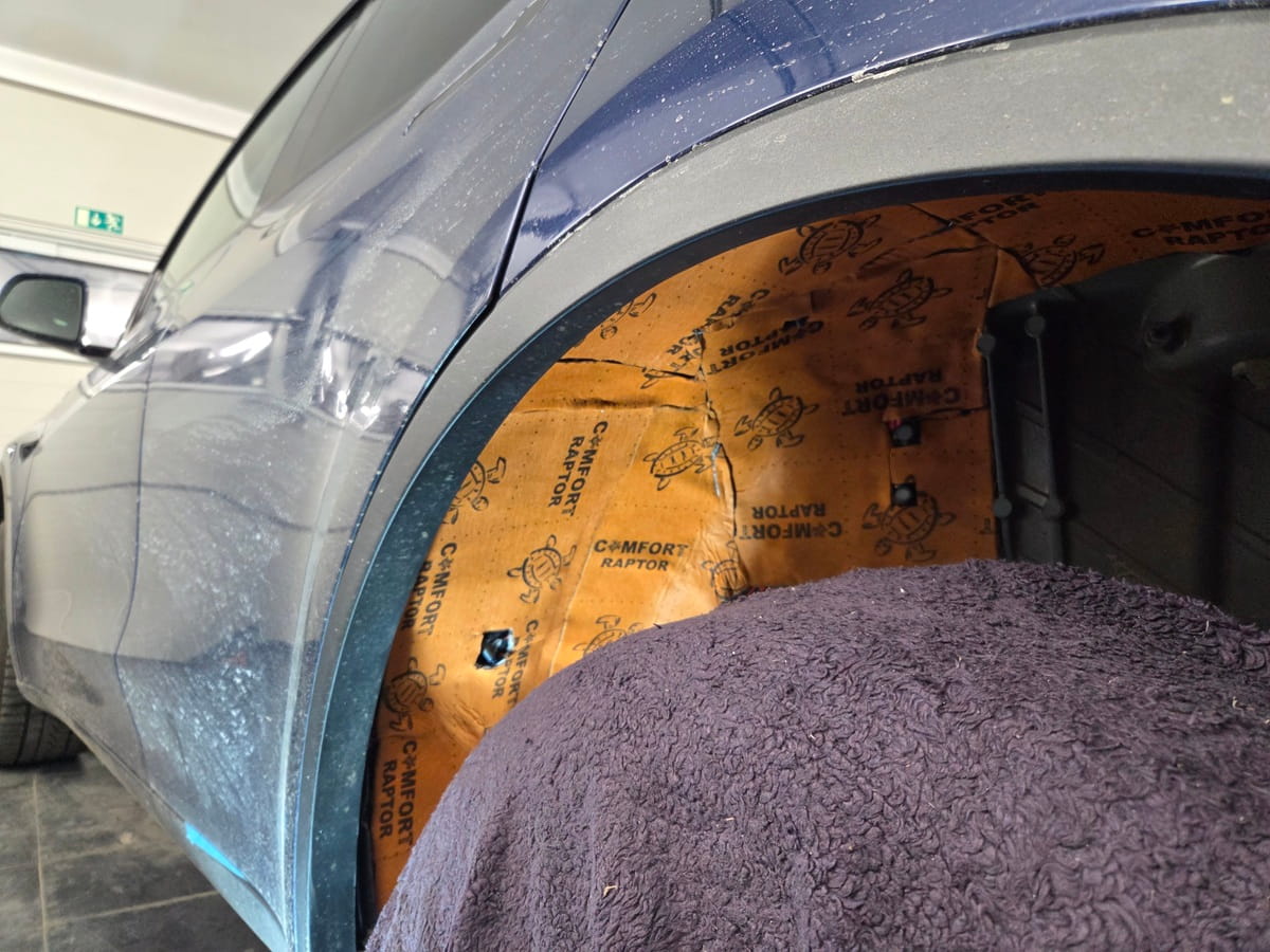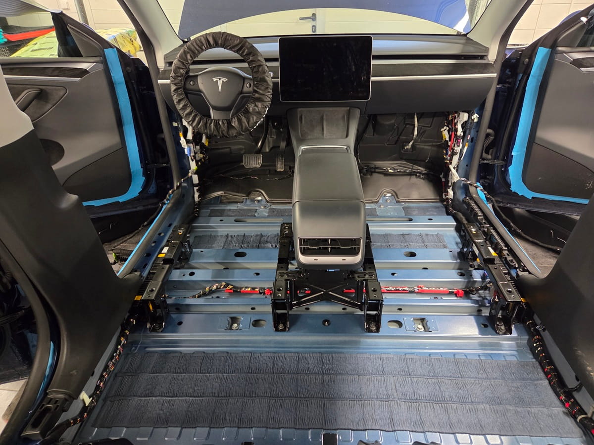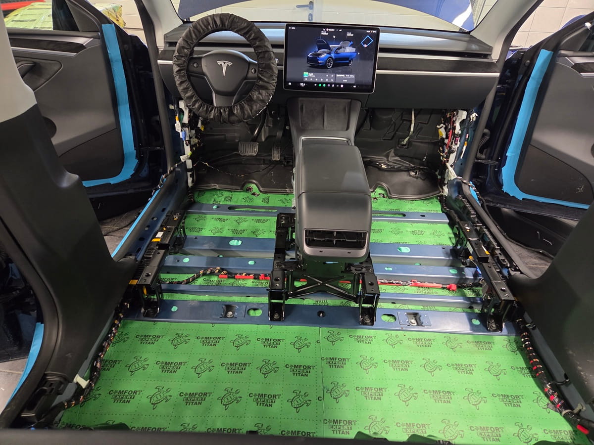 Tesla Model Y je oblíbené SUV střední velikosti. Pokud od něj zákazník, jakožto od elektromobilu, očekává tichou jízdu, je často velmi zklamaný. Tovární zvuková izolaci prakticky chybí a téměř holé plechy pouze s bodovou snahou o zpevnění jsou náchylné k vibracím, rezonancím a dalším nepříjemným zvukům. Výrazné hučení od kol je pak stejné jako u konvenčních aut. Zákazník nás proto oslovil s výrazným odhlučněním vozu v nejoblíbenější variantě Premium, kterou jsme dále upgradovali o prvky z nejvyššího rozsahu Exclusive. Konkrétně se jednalo o efektivnější druhou vrstvu na podlahu, výplňové bloky do dutin, odhlučnění prahových lišt a zadních podběhů i z vnější strany. Každá jízda je nyní mnohem příjemnější díky zásadně vyššímu akustickému komfortu.