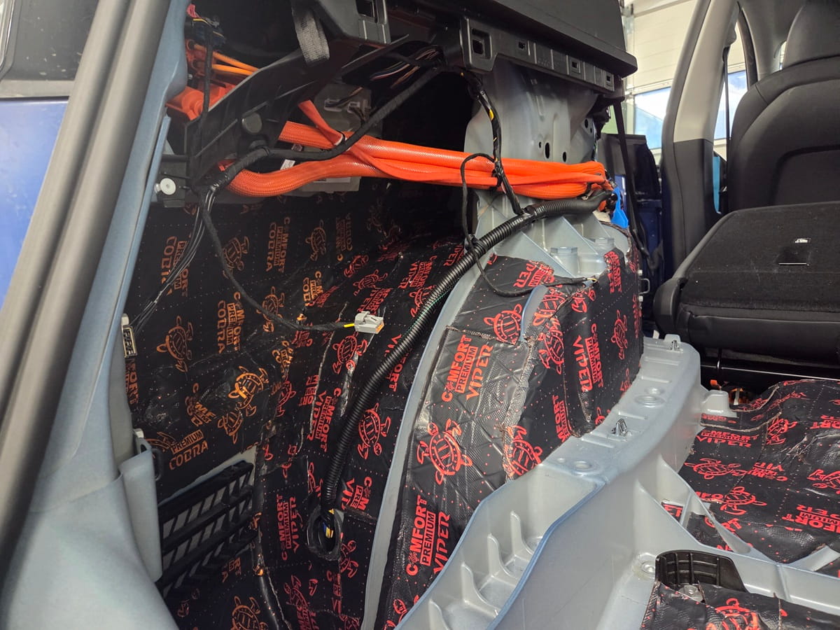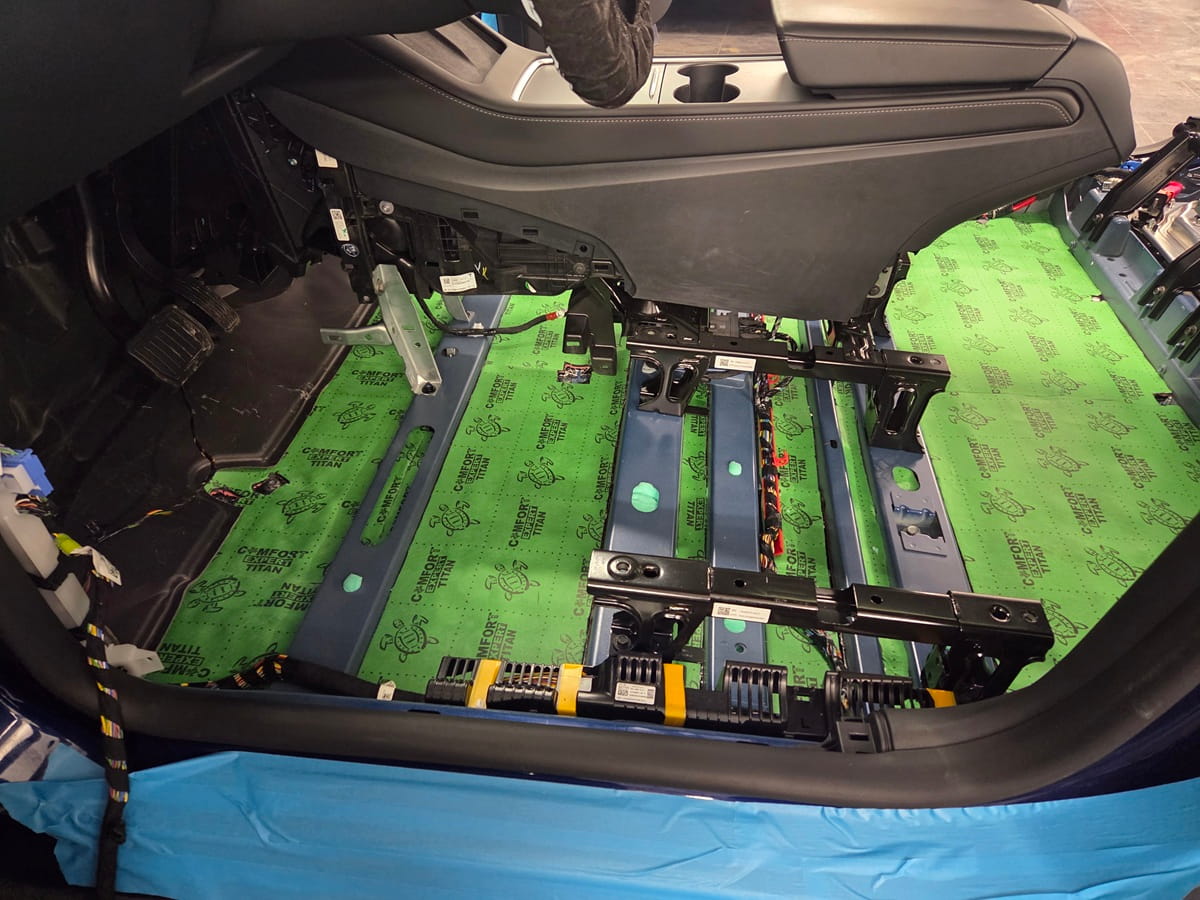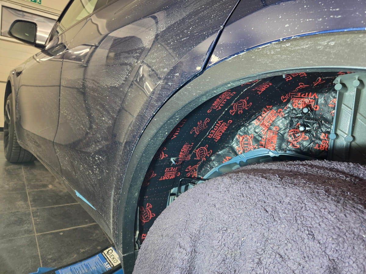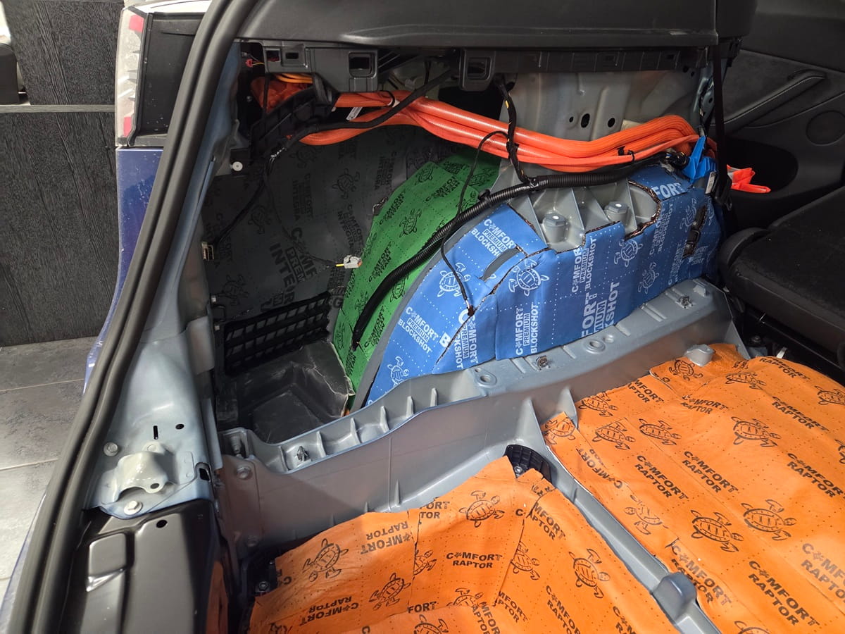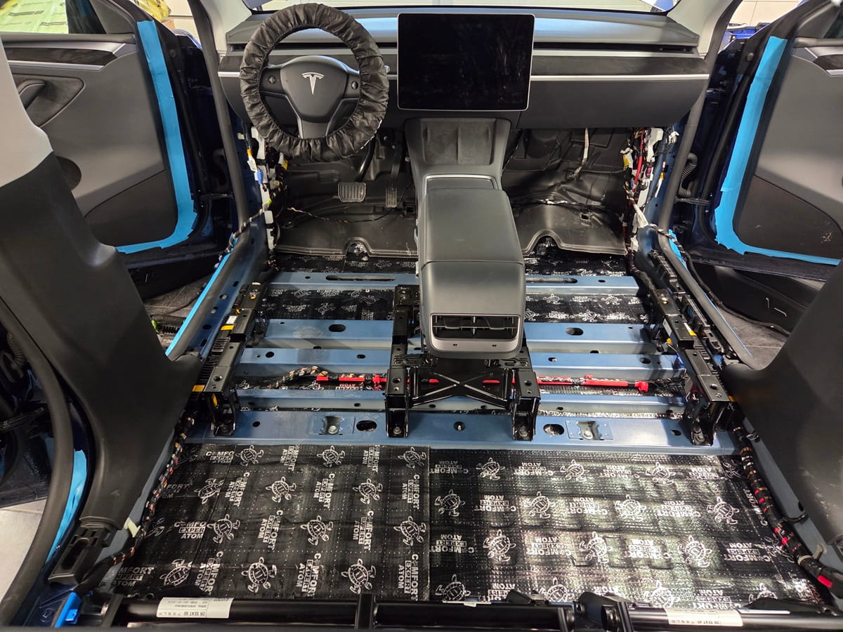 Tesla Model Y je oblíbené SUV střední velikosti. Pokud od něj zákazník, jakožto od elektromobilu, očekává tichou jízdu, je často velmi zklamaný. Tovární zvuková izolaci prakticky chybí a téměř holé plechy pouze s bodovou snahou o zpevnění jsou náchylné k vibracím, rezonancím a dalším nepříjemným zvukům. Výrazné hučení od kol je pak stejné jako u konvenčních aut. Zákazník nás proto oslovil s výrazným odhlučněním vozu v nejoblíbenější variantě Premium, kterou jsme dále upgradovali o prvky z nejvyššího rozsahu Exclusive. Konkrétně se jednalo o efektivnější druhou vrstvu na podlahu, výplňové bloky do dutin, odhlučnění prahových lišt a zadních podběhů i z vnější strany. Každá jízda je nyní mnohem příjemnější díky zásadně vyššímu akustickému komfortu.