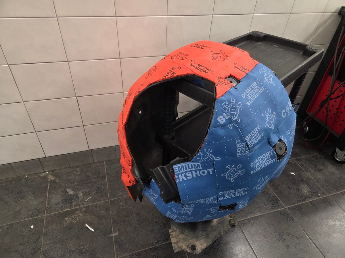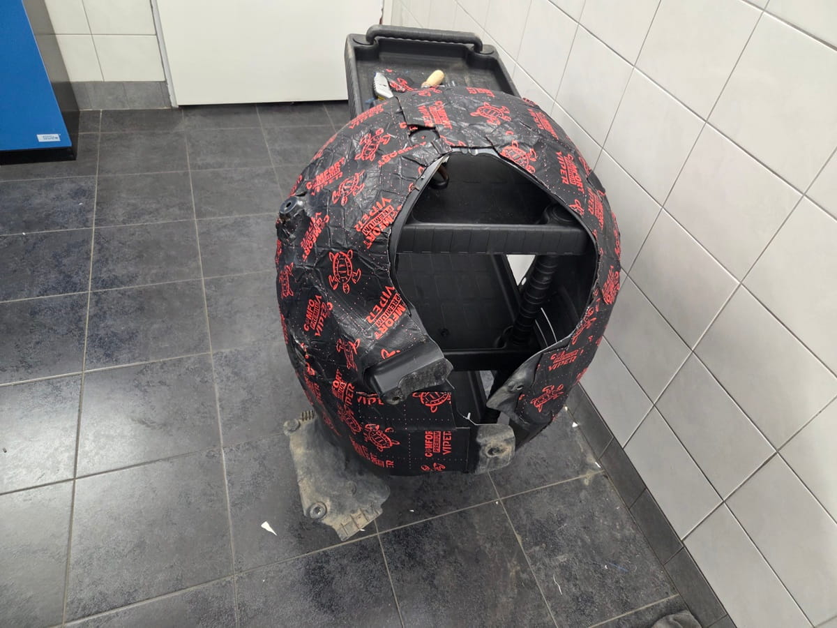 Plastový přední podběh je nejdříve zpevněn antivibračním materiál, na který lepíme zvukově izolační druhou vrstvu