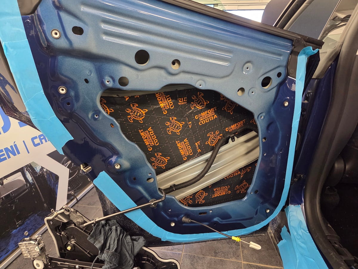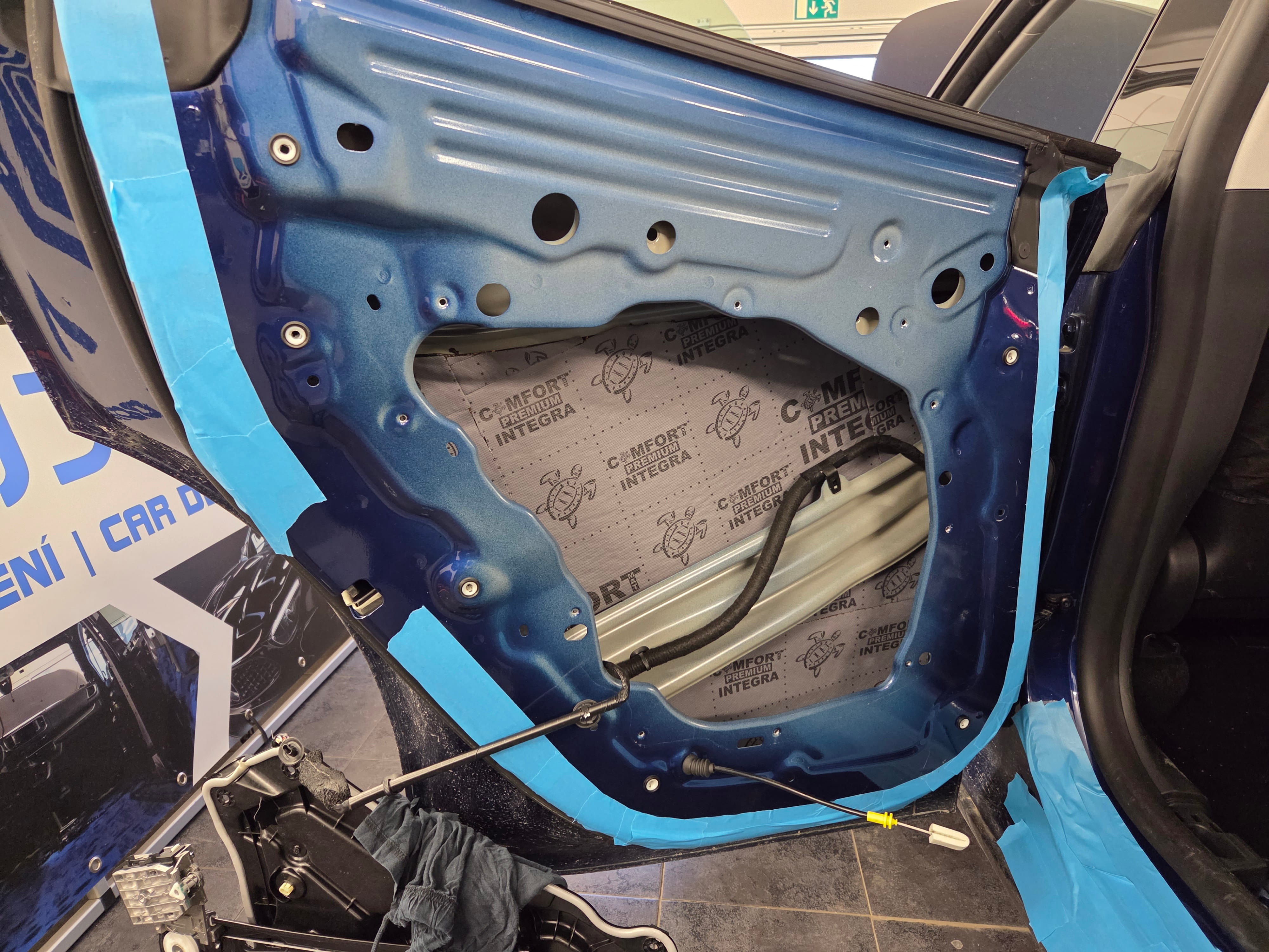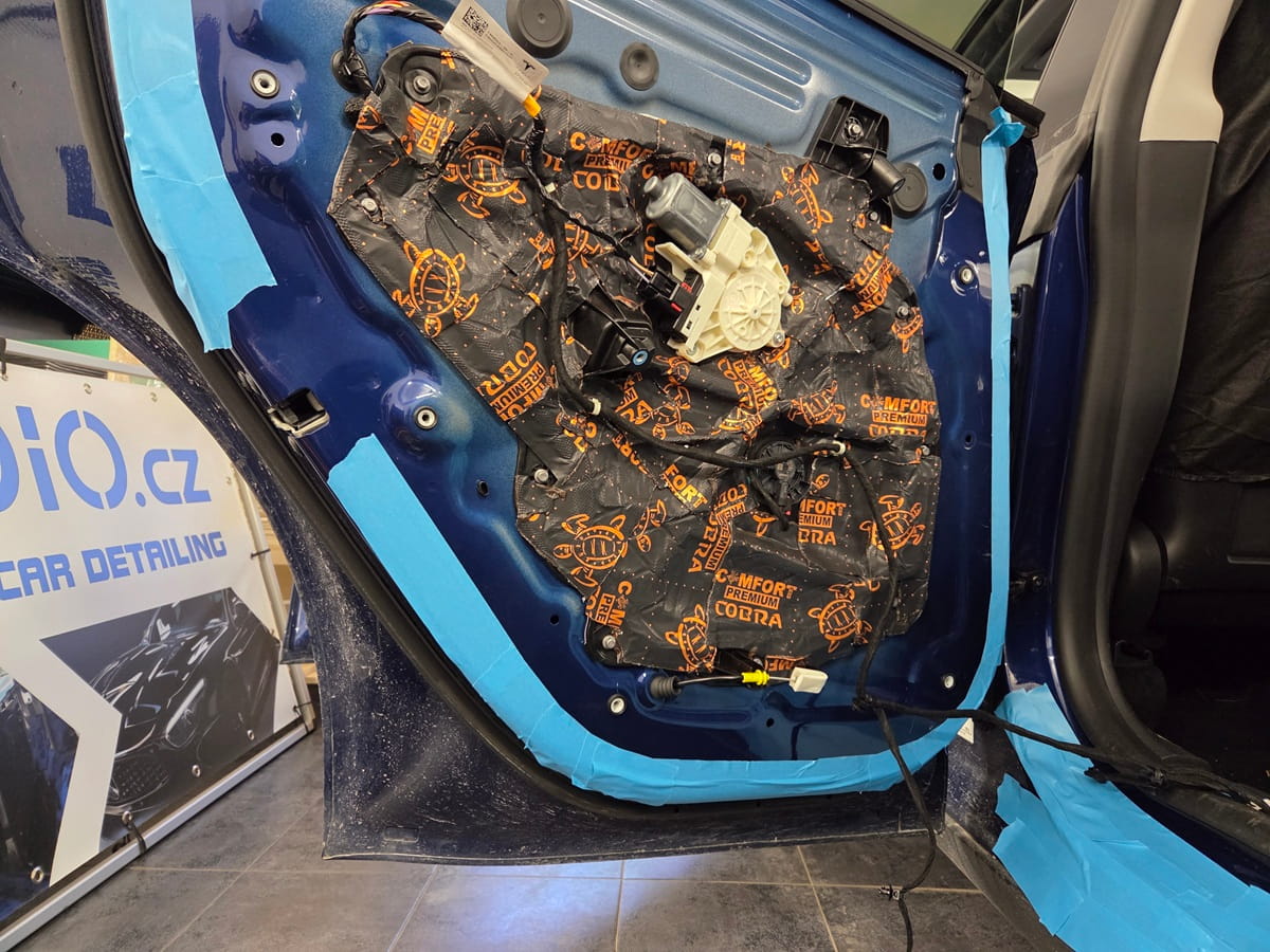 V první vrstvě je vnitřní část dveří ošetřena antivibračním materiálem. Ten přilne k plechu a nepustí k němu vlhkost, takže je zároveň antikorozivní